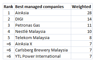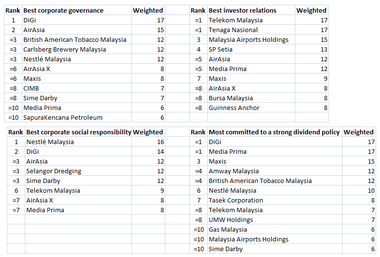 which looks to determine Asia's best companies as voted by investors and analysts. Launched on February 10, 2014, polling was conducted over one month. We will release the results in chunks Part four covers Malaysia.
